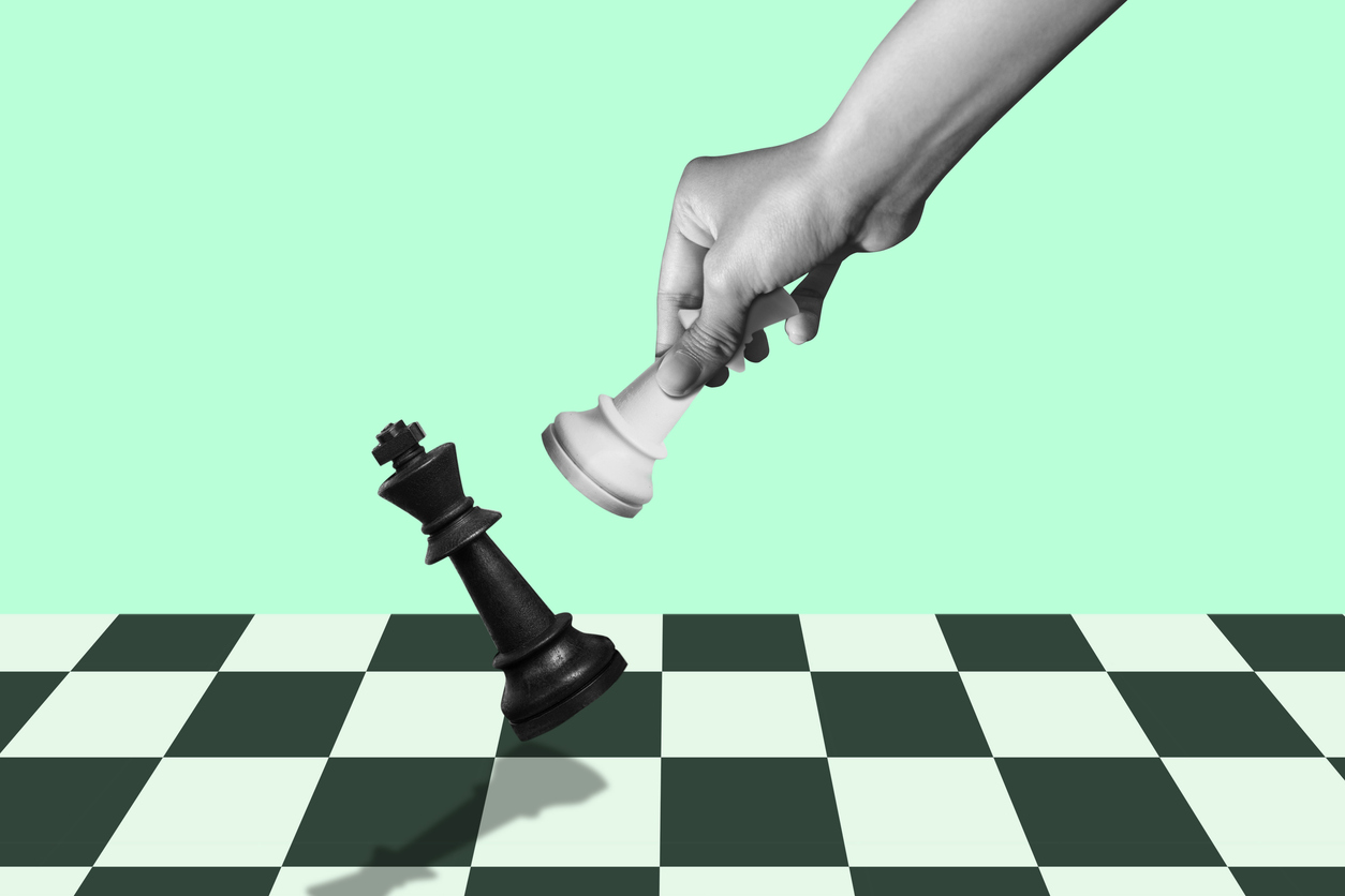 Check mate. hand of businessman moving chess figure Trendy 3d collage in magazine style. Contemporary art. Modern design