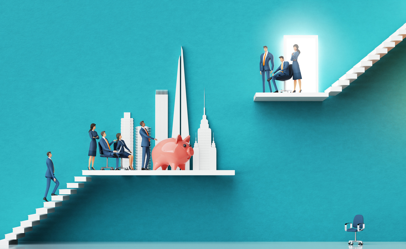 Business team introducing a new startup in finance to investors. Business environment concept with stairs and open door representing prospects, opportunity, achievement, success. 3D rendering