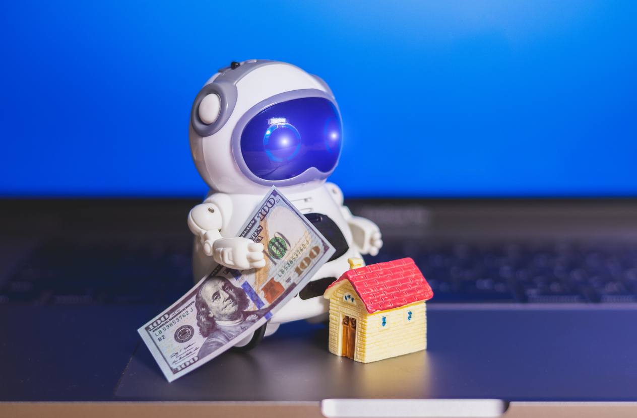Robot with dollars money and house.Buying and renting real estate. Bank credit for property. Save money. Digital development.