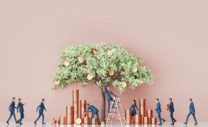Business people, collection the profits from the money tree. 3d rendering illustration